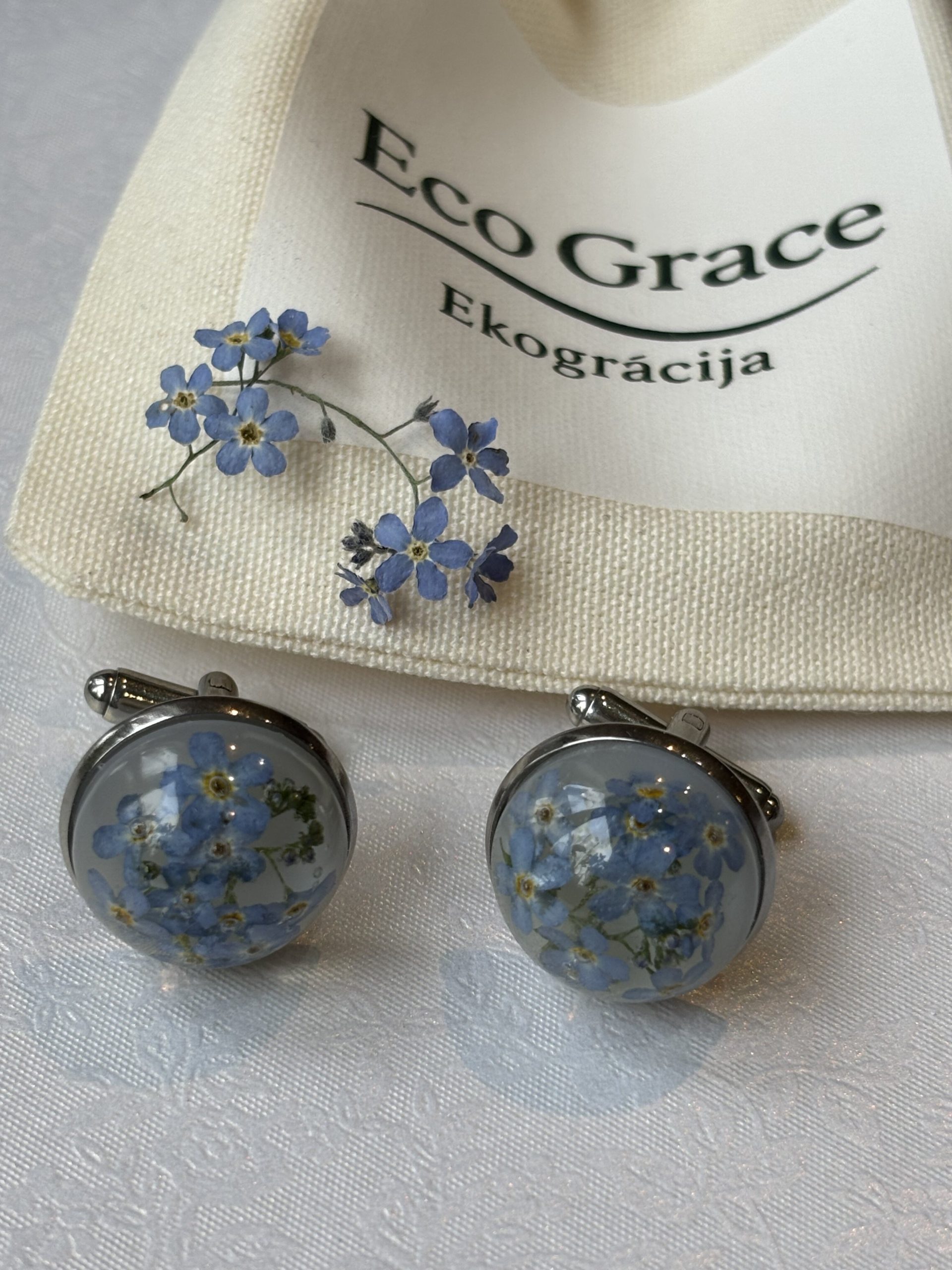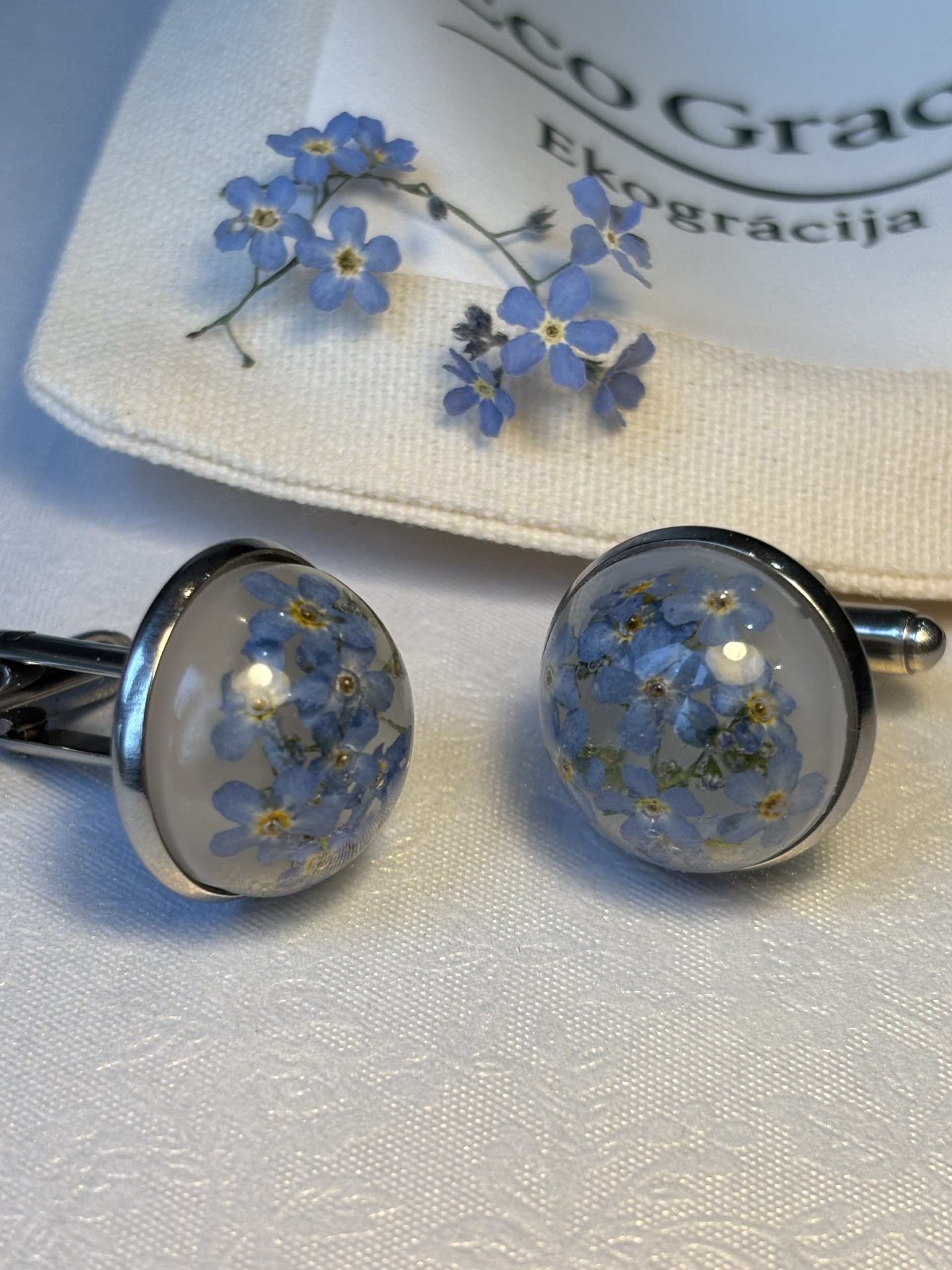 Apročpogas “Neaizmirstulītes”, ielietas dzidrā epoksīdā, saglabā sīko neaizmirstulīšu ziedu trauslo skaistumu un maigo zilumu. Smalkie ziedi rada elegantu un neaizmirstamu akcentu, kas padara Tavu tēlu īpašu.