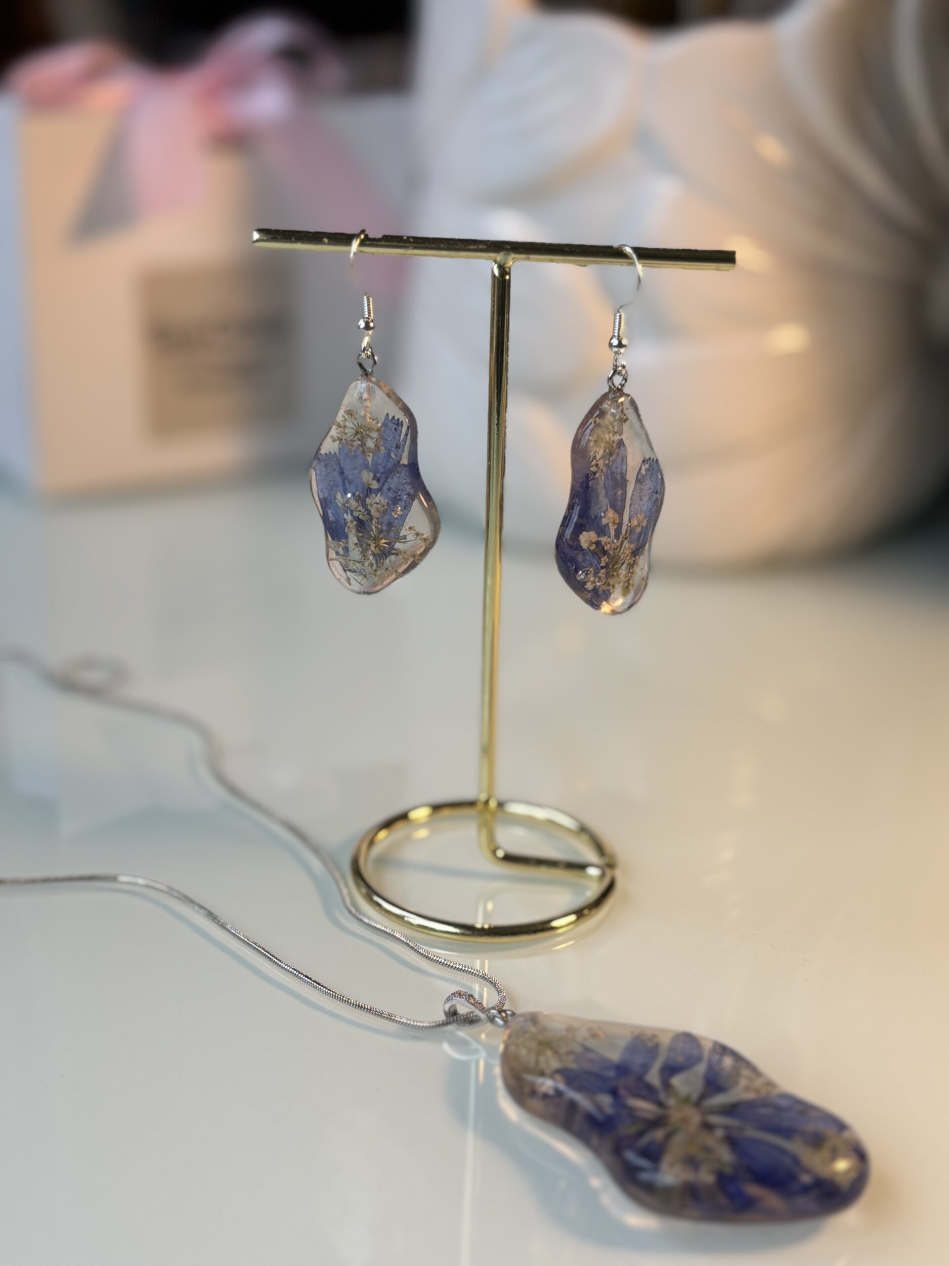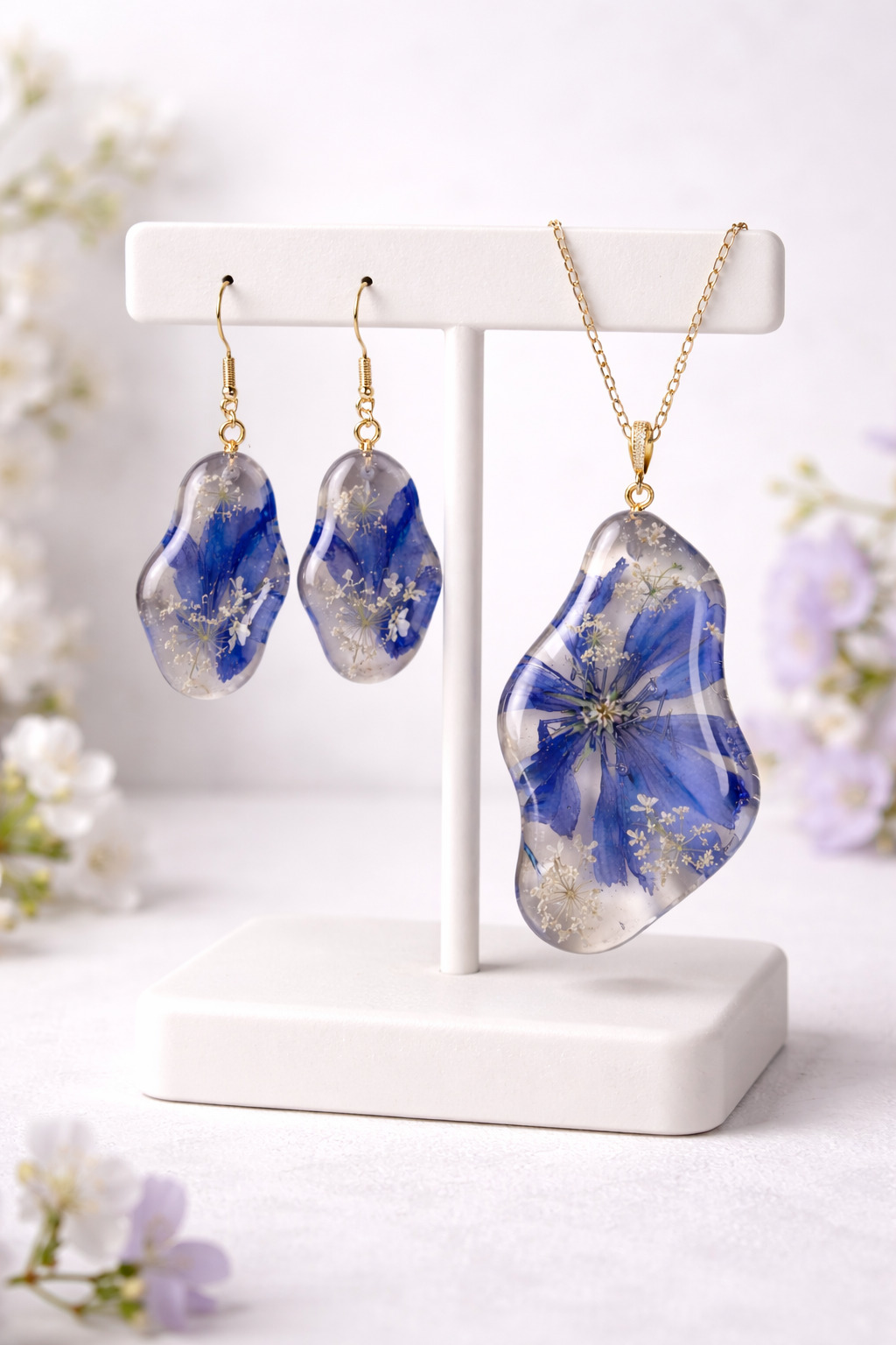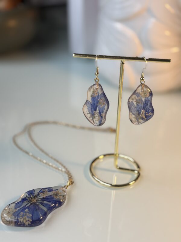 Roku darināti auskari ar īstiem cigoriņu ziediem un smalkiem savvaļas burkāna zieda akcentiem — rūpīgi iemūžināti kristāldzidrā epoksīdā,