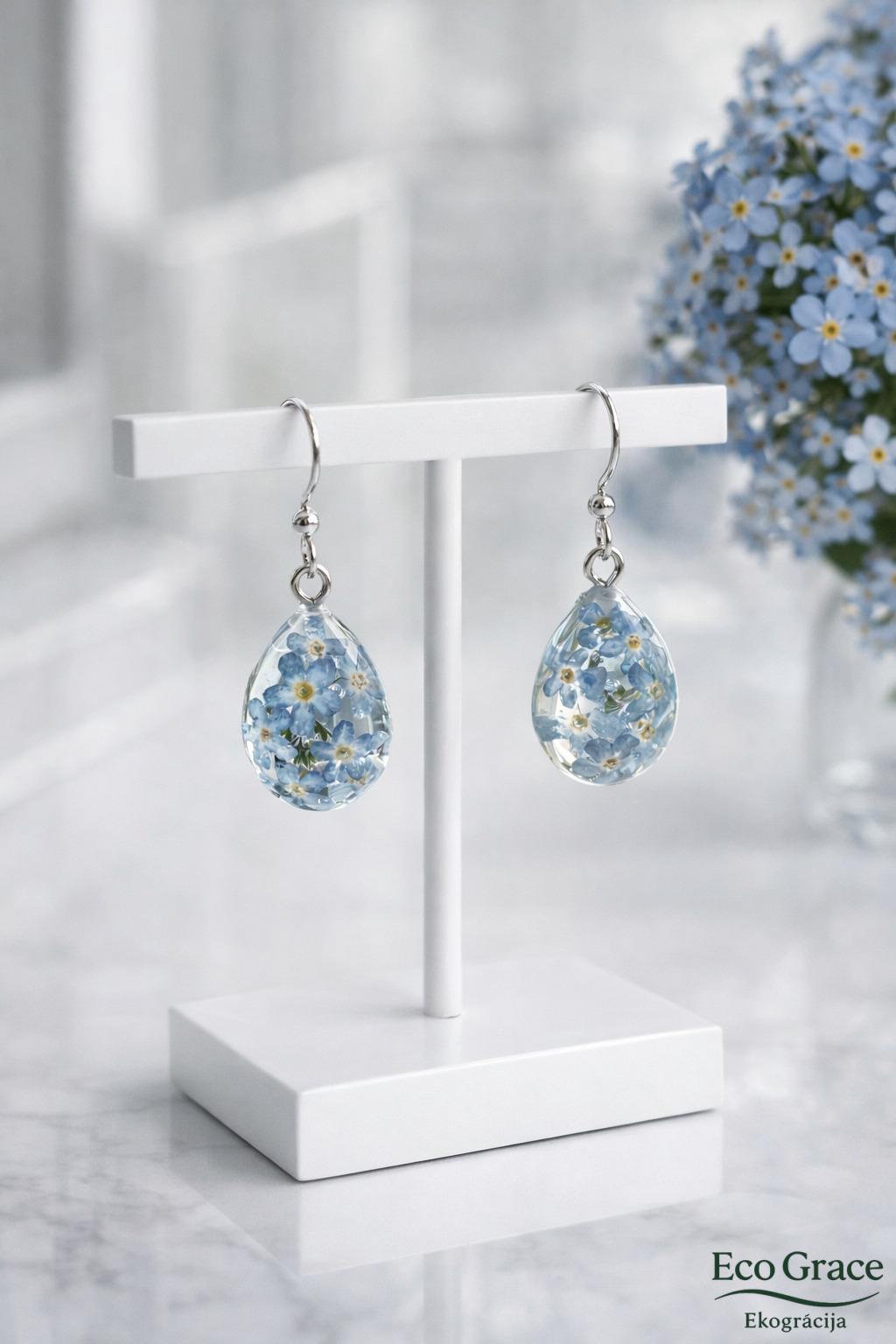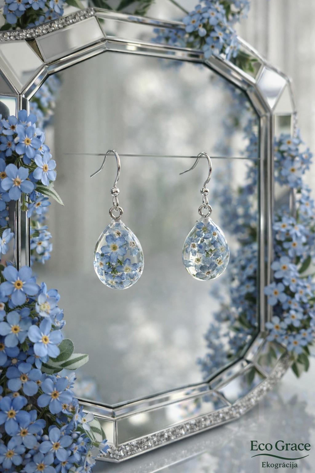 Tajos iemūžinātas pašu vāktas neaizmirstulītes, saglabājot katra zieda trauslo skaistumu un dzidro krāsu. Smalkā lāsītes forma piešķir auskariem vieglumu un eleganci, ļaujot ziediem mirdzēt kā rasas pilieniem rīta saulē.