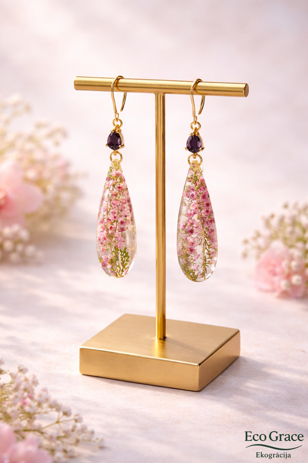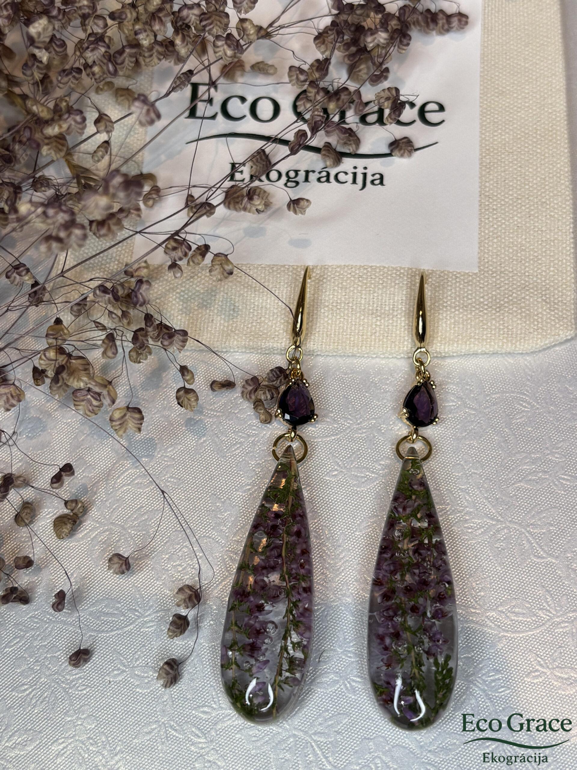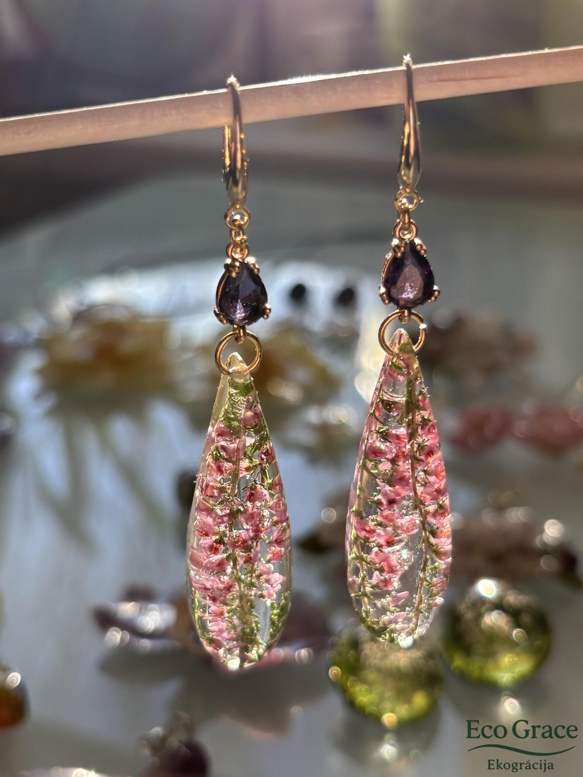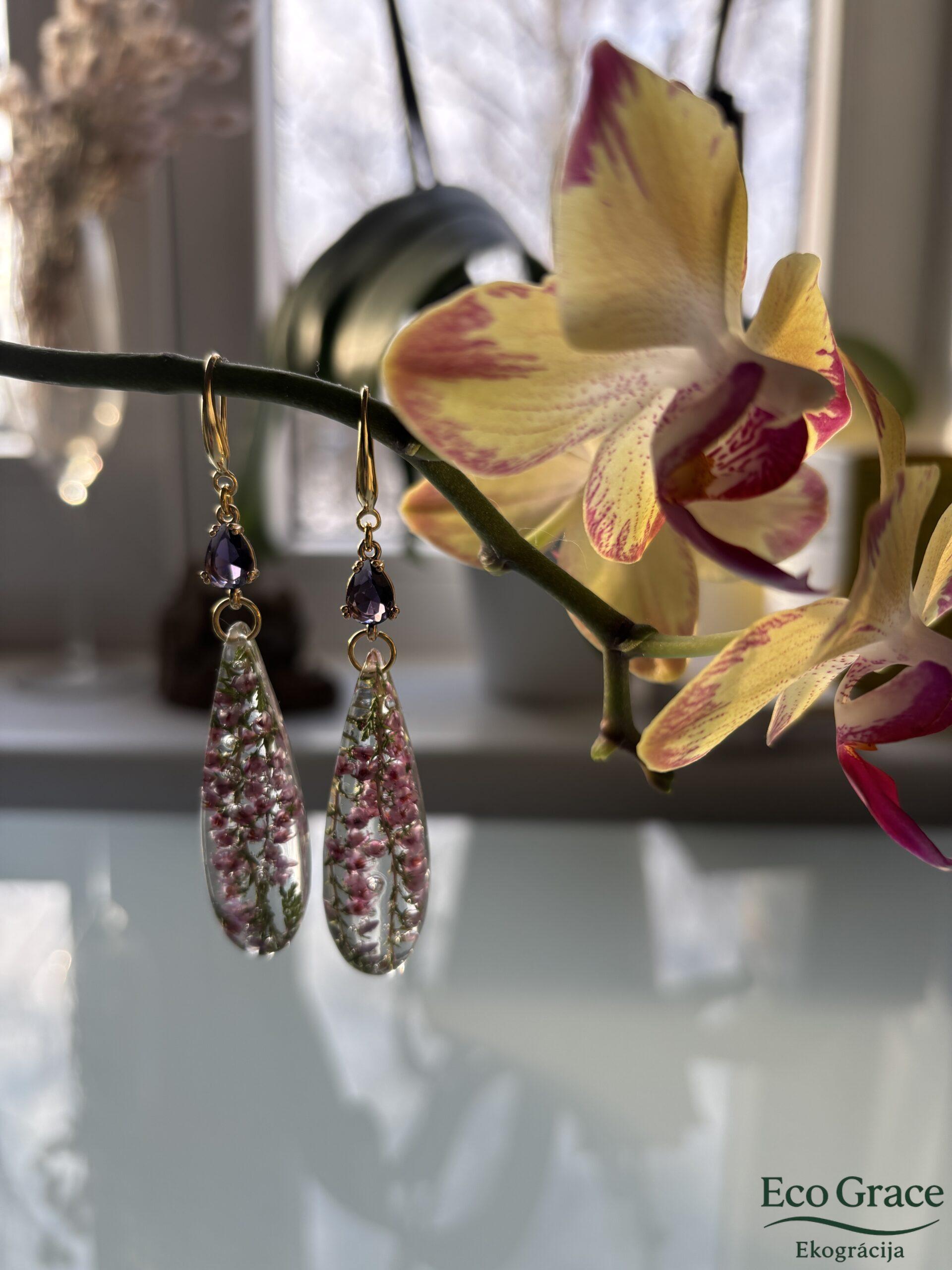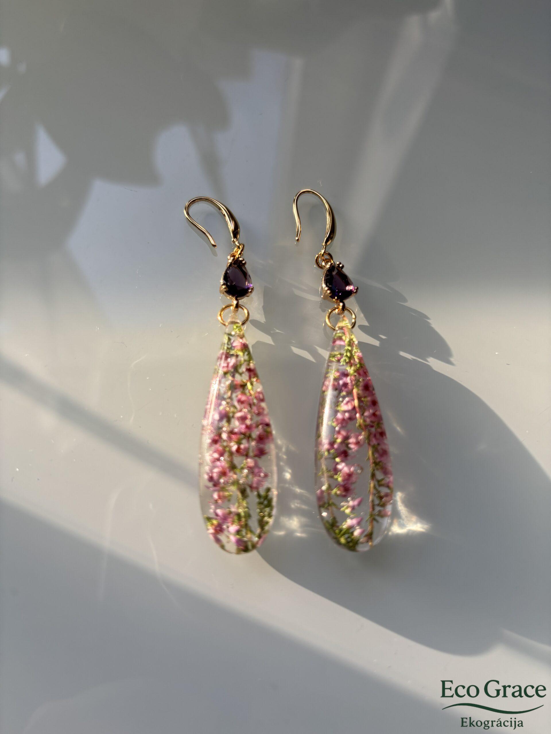 Smalki, dabīgi viršu ziedi, iemūžināti kristāldzidrā epoksīdā, rada vieglus un eleganta rakstura auskarus. Katrs pāris – unikāls, viegls un sievišķīgs.