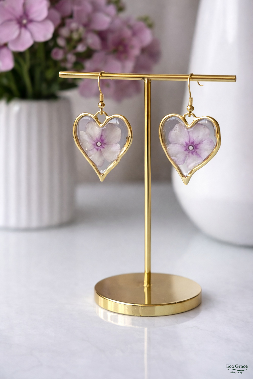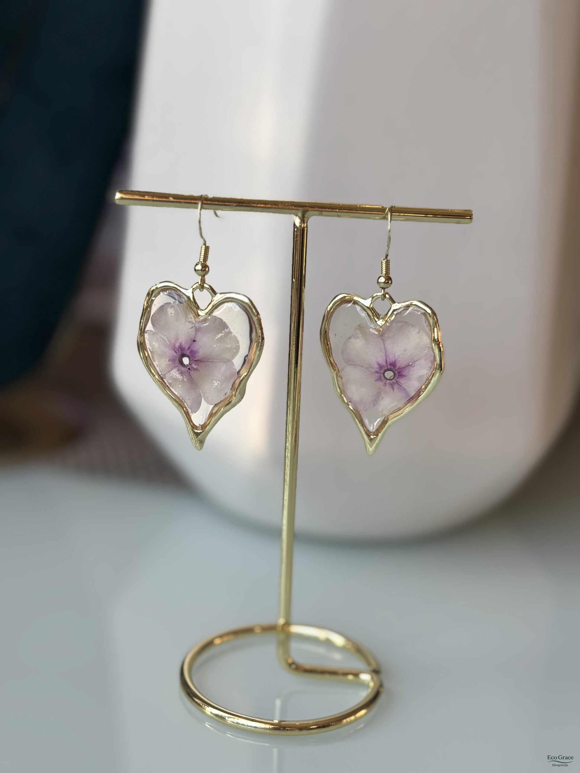 Šie auskari ir roku darbs, radīti ar mīlestību no pašu audzētiem flokšiem, tāpēc katrs pāris ir īpašs un neatkārtojams. Tie piešķir tēlam rotaļīgu, gaisīgu un romantisku noskaņu – kā radīti pavasara un vasaras dienām.