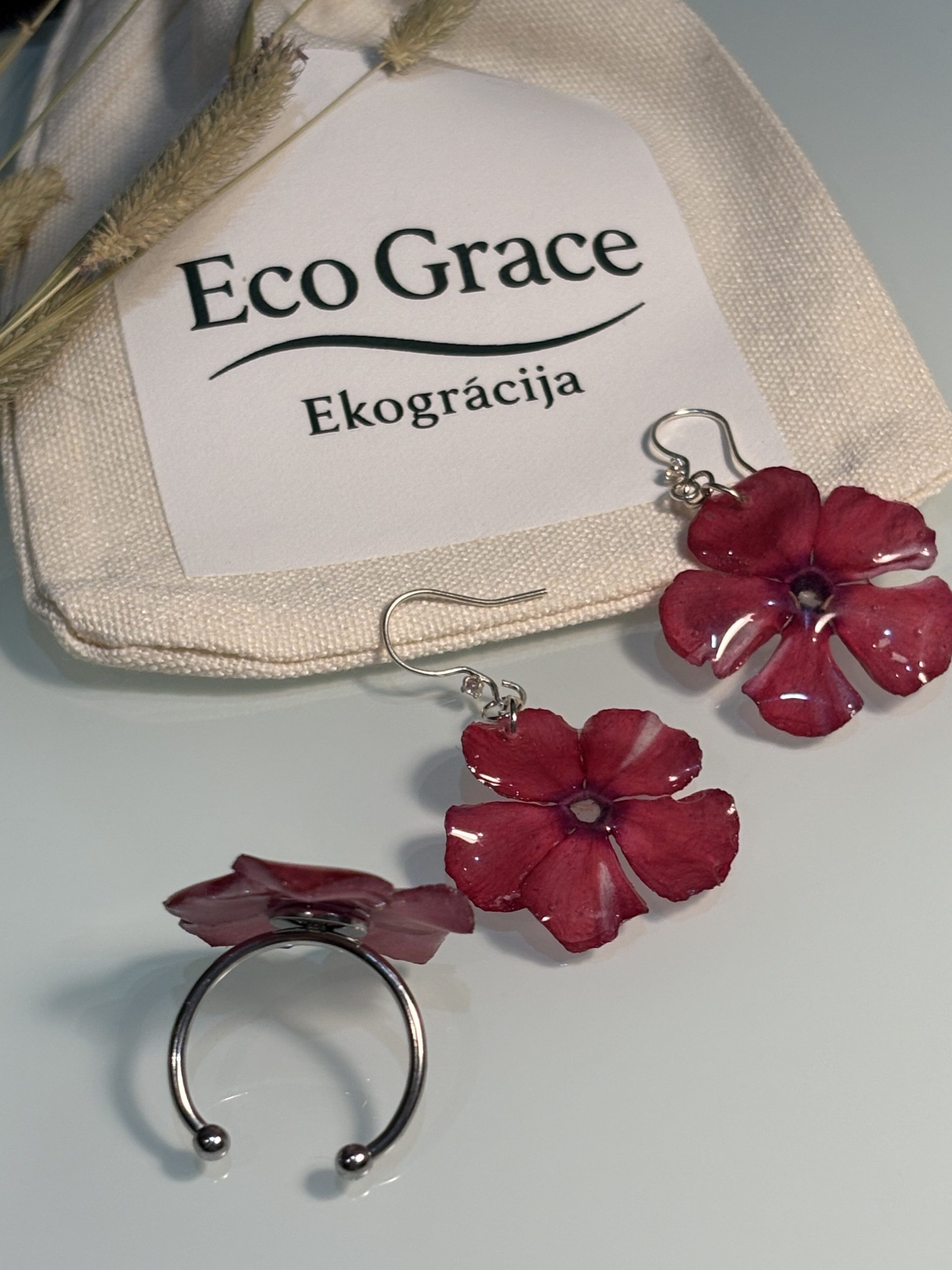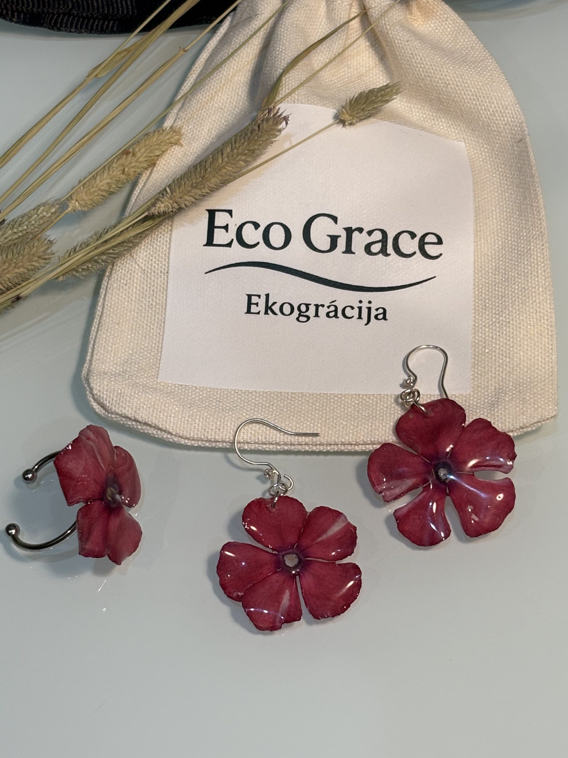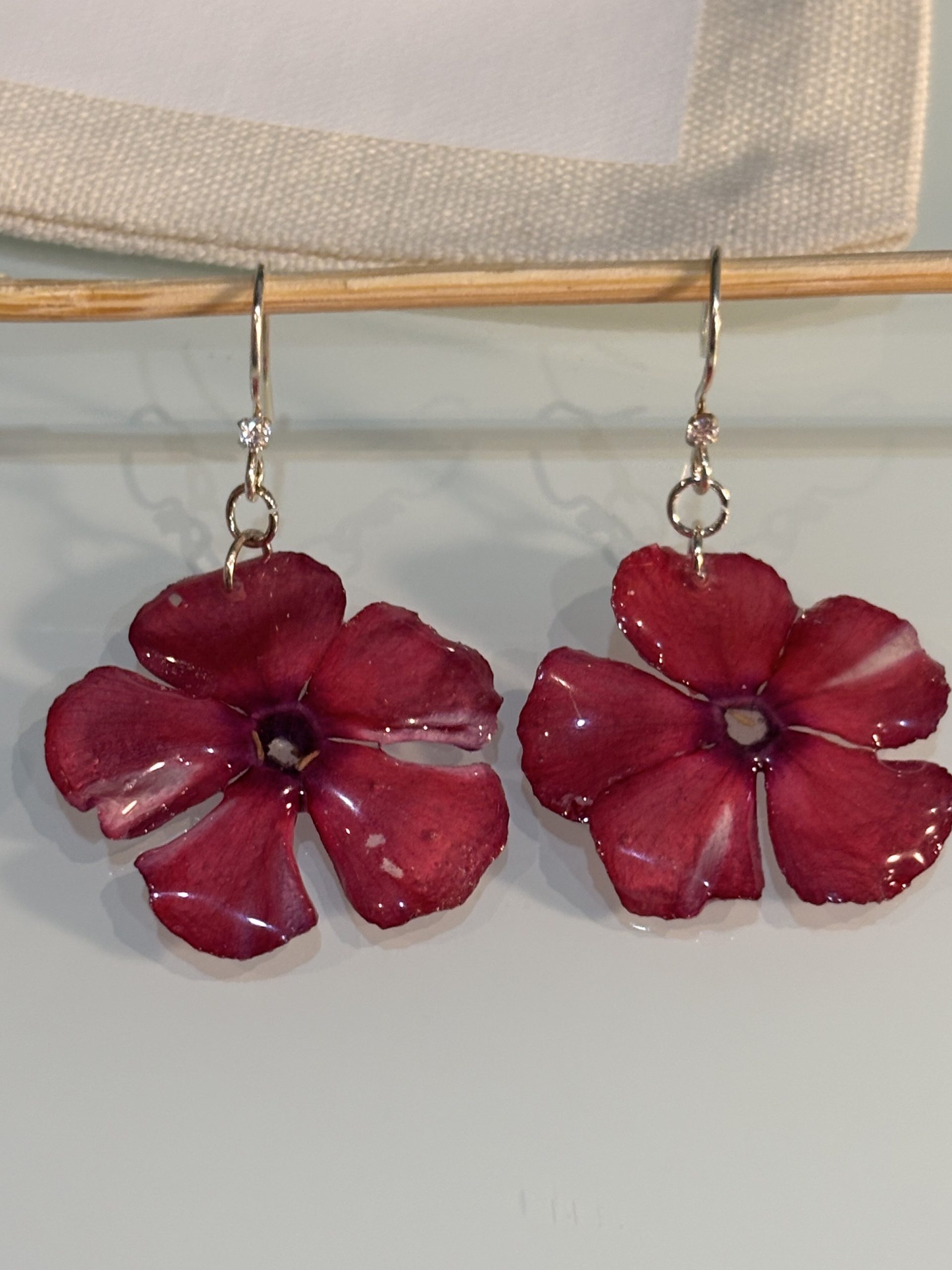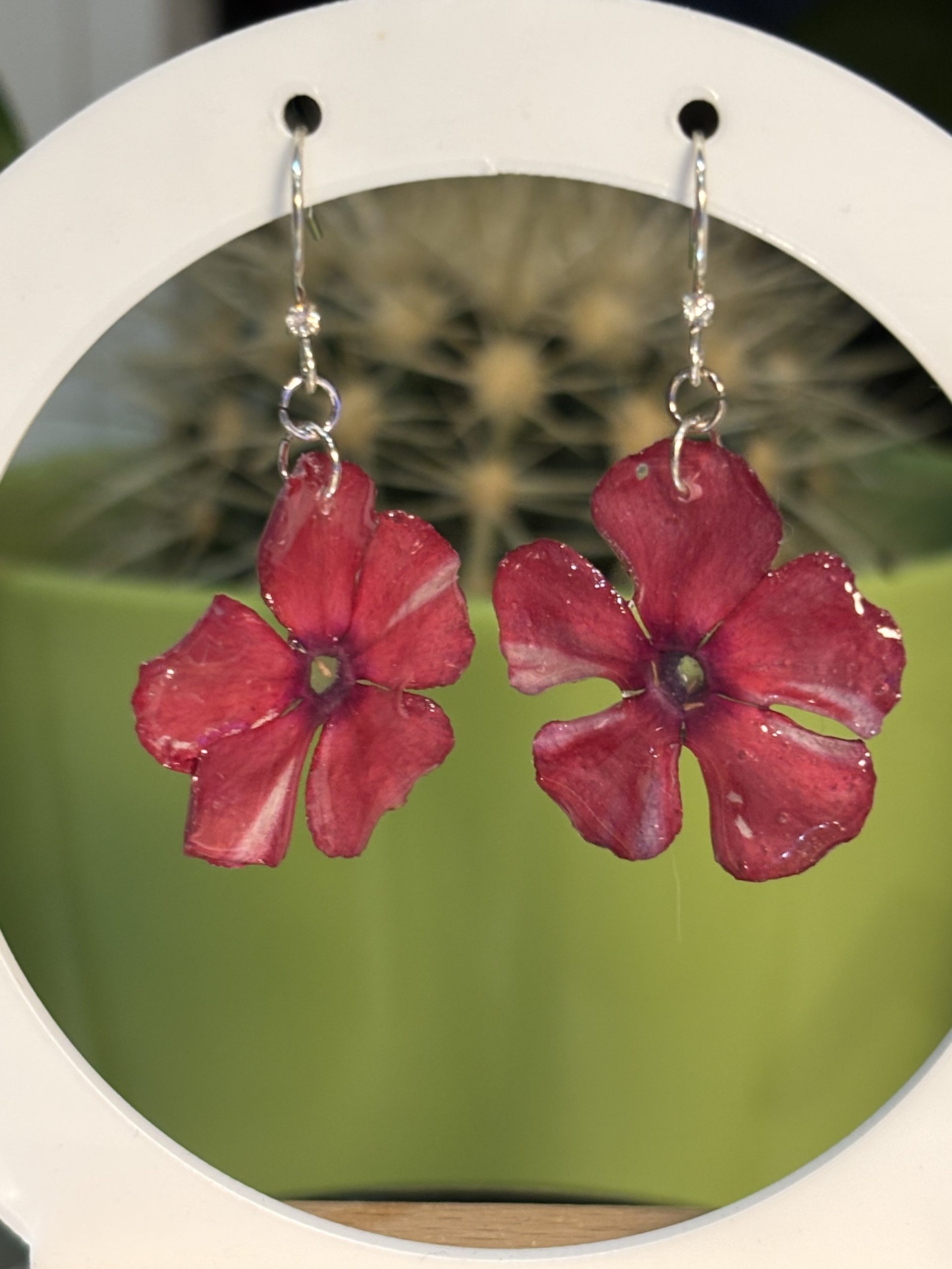 Flokšu ziedu auskari, ielieti dzidrā epoksīdā, saglabā zieda dabisko krāsu un raksturu kā nelielu vasaras mirkli. Katrs zieds ir unikāls, padarot katru auskaru pāri neatkārtojamu.