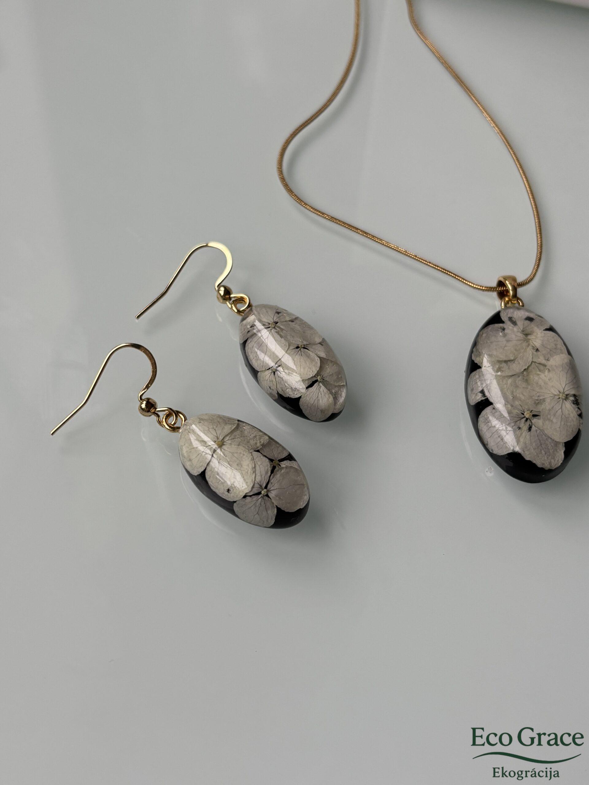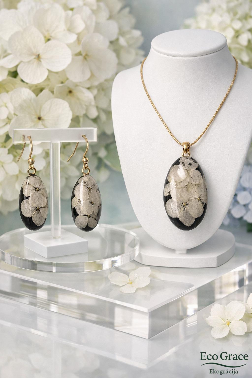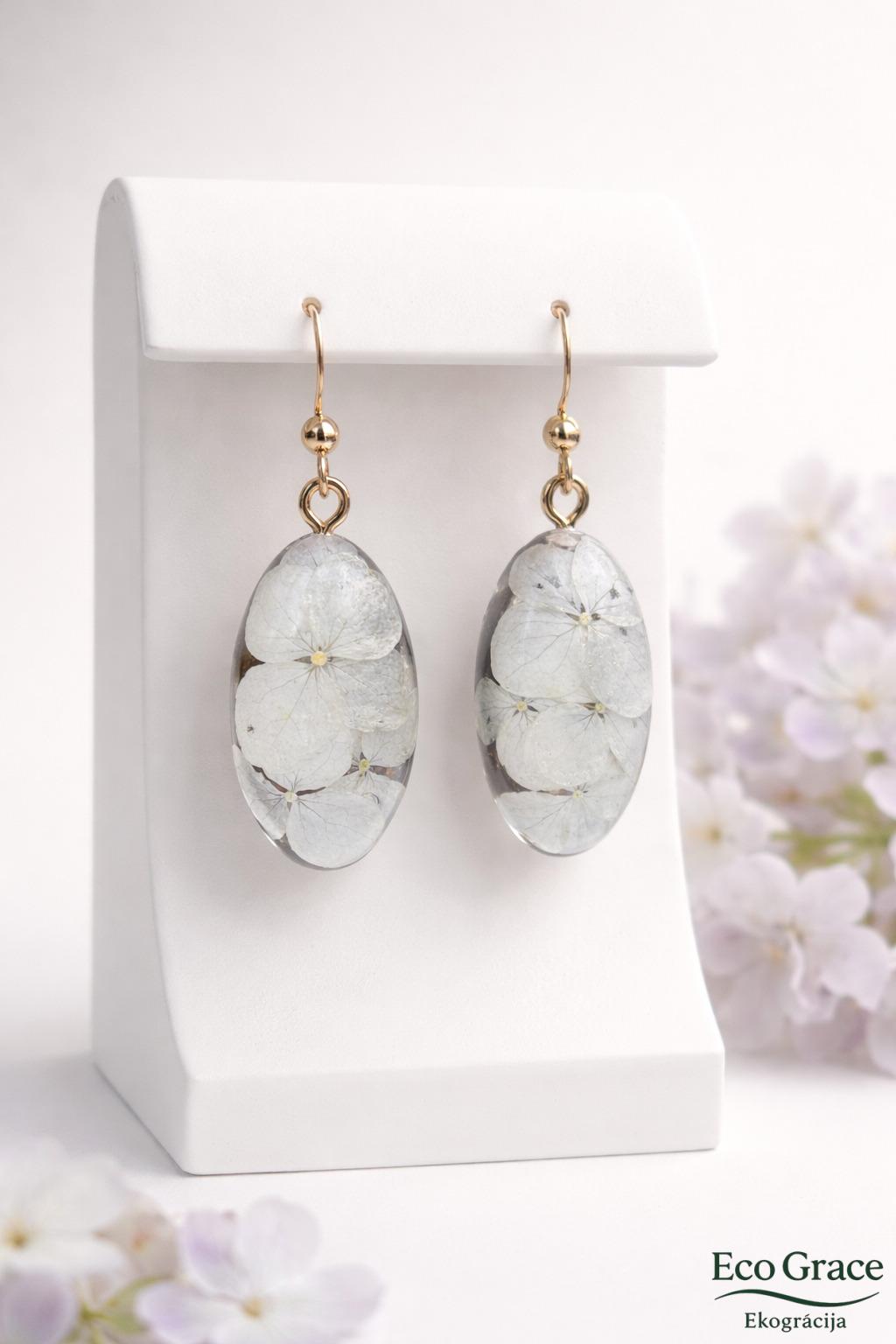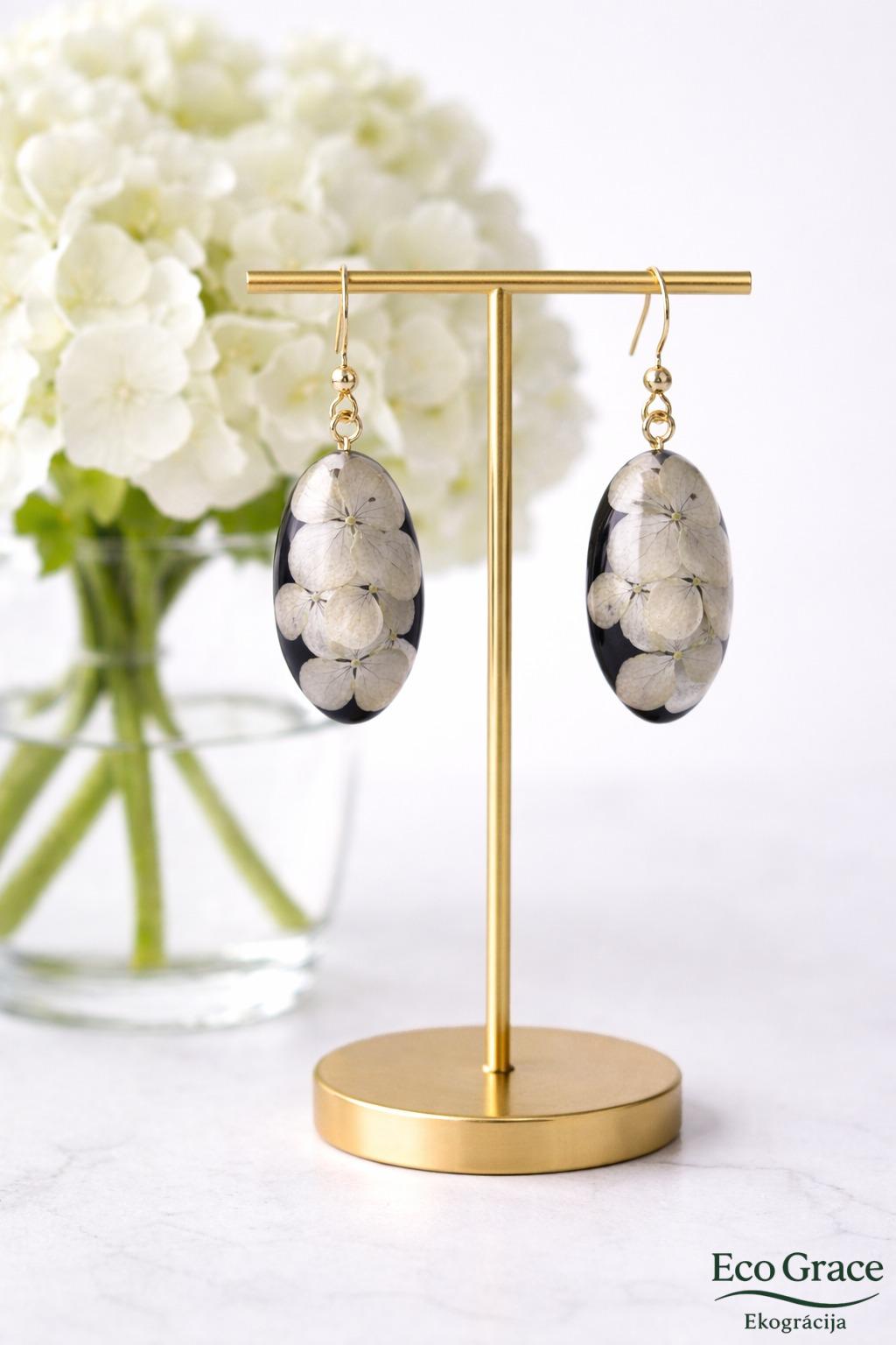 Epoksīdā iestrādāti smalki balti dabīgu hortenziju ziedi, kas izceļas uz dziļā kafijas pupiņu toņa fona, rada noskaņu, kur daba satiekas ar mūsdienīgu dizainu. Katrs auskaru pāris ir unikāls — kā mirklis, kas saglabāts uz mūžu.