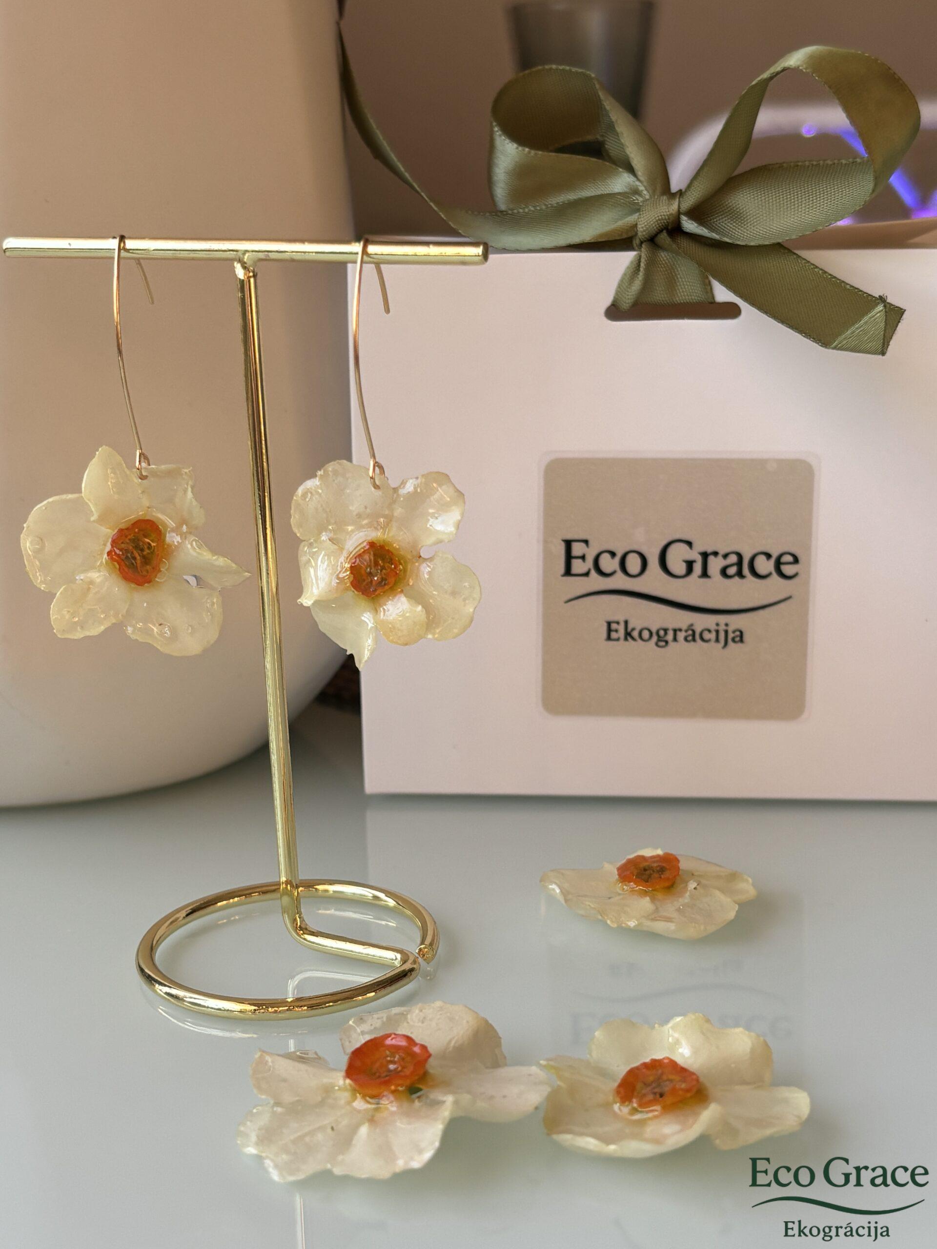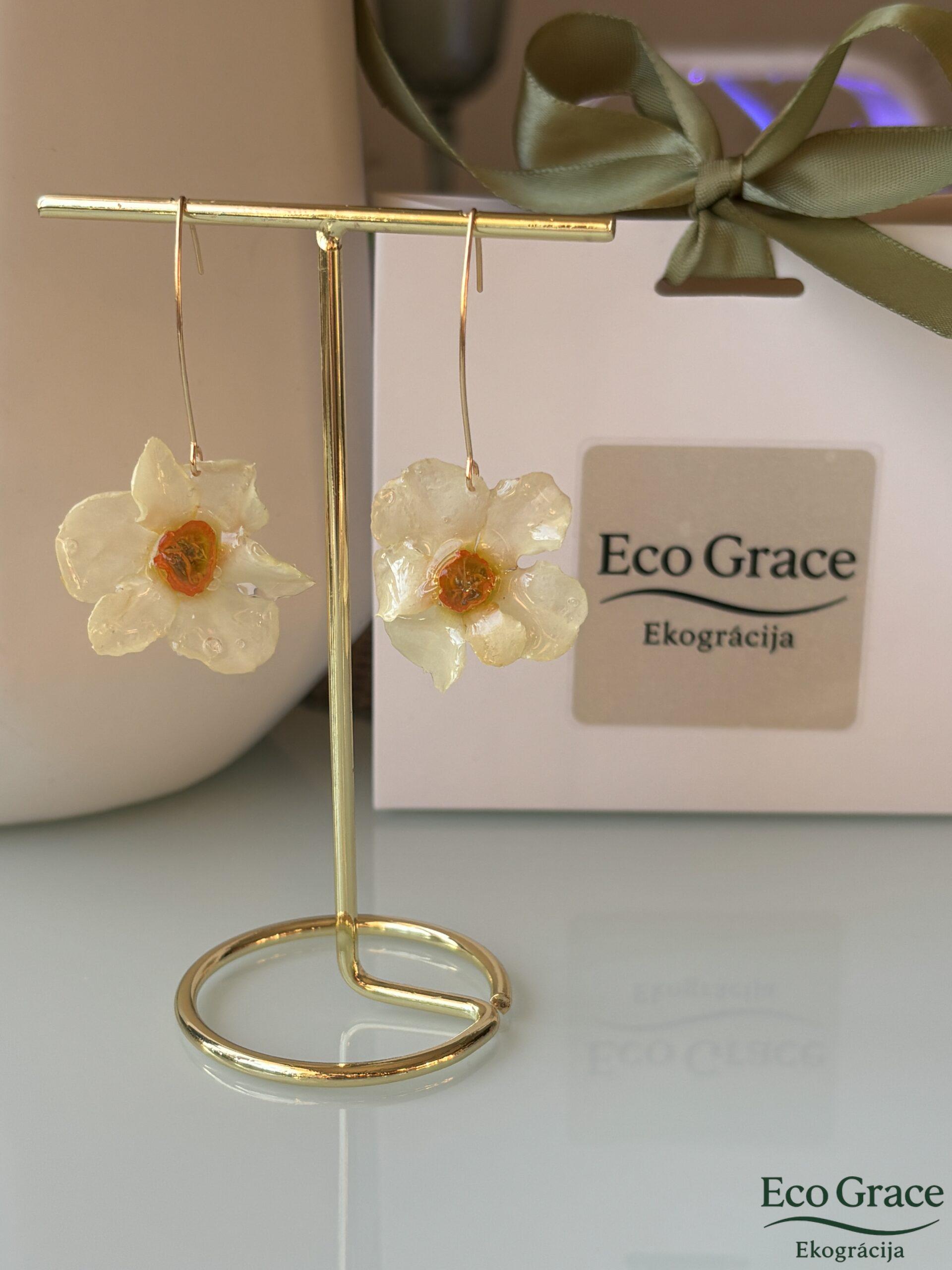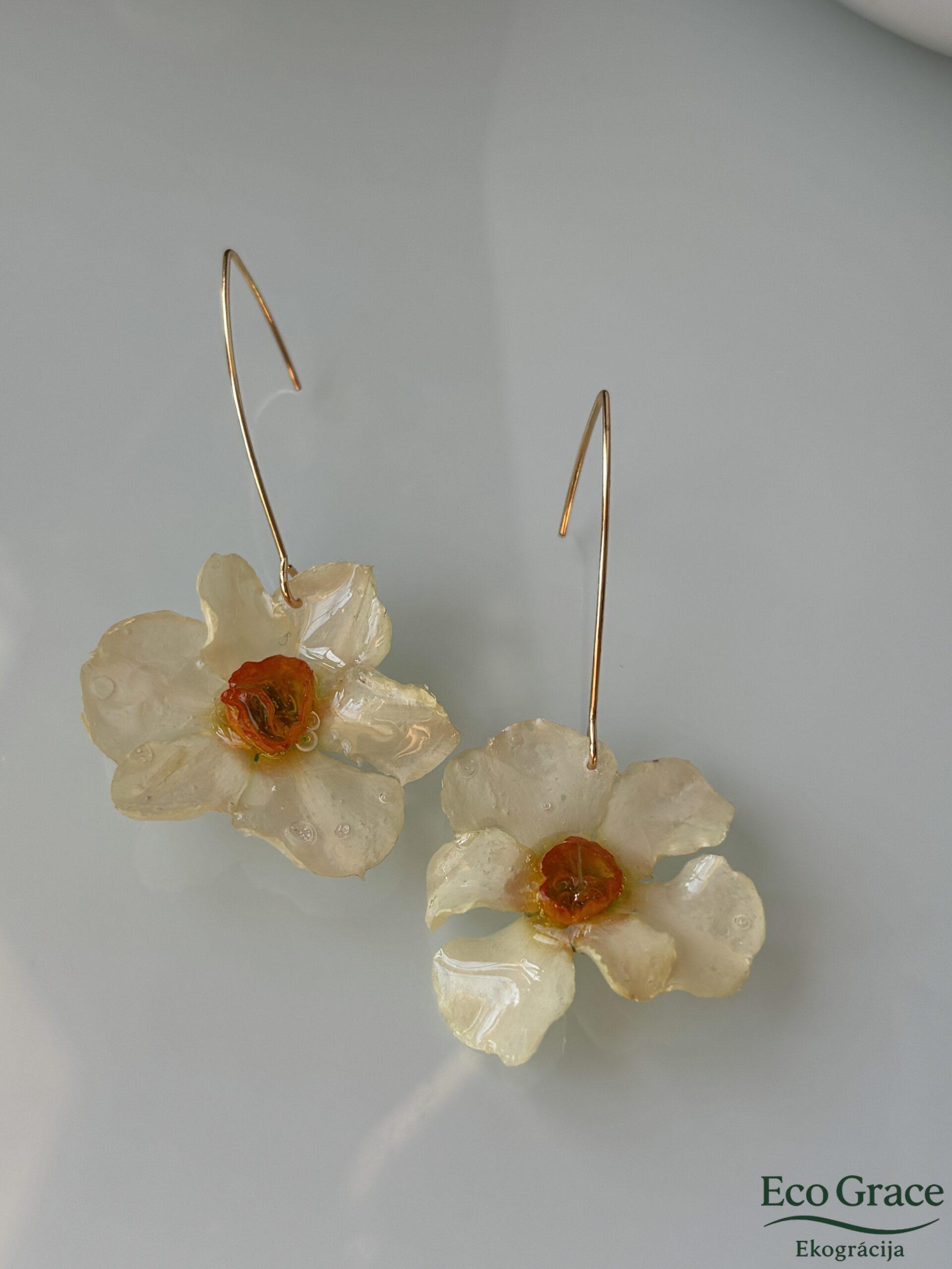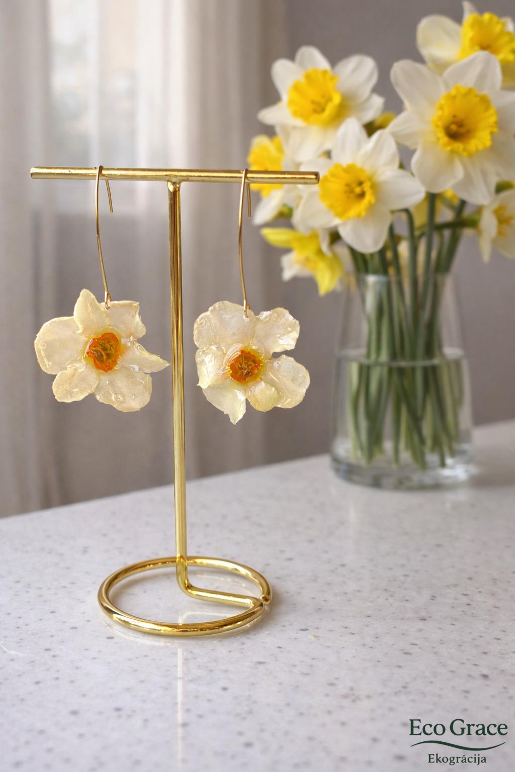Šīs brīnišķīgās pirmās pavasara narcises, tikko uzplaukušas un saules pieskāriena lutinātas, pārtapušas smalkos, vieglos auskaros. Zieda dabīgais skaistums saglabāts tā patiesajā formā – nekā lieka, nekā pārspīlēta, tikai pats zieds visā savā trauslajā burvībā.