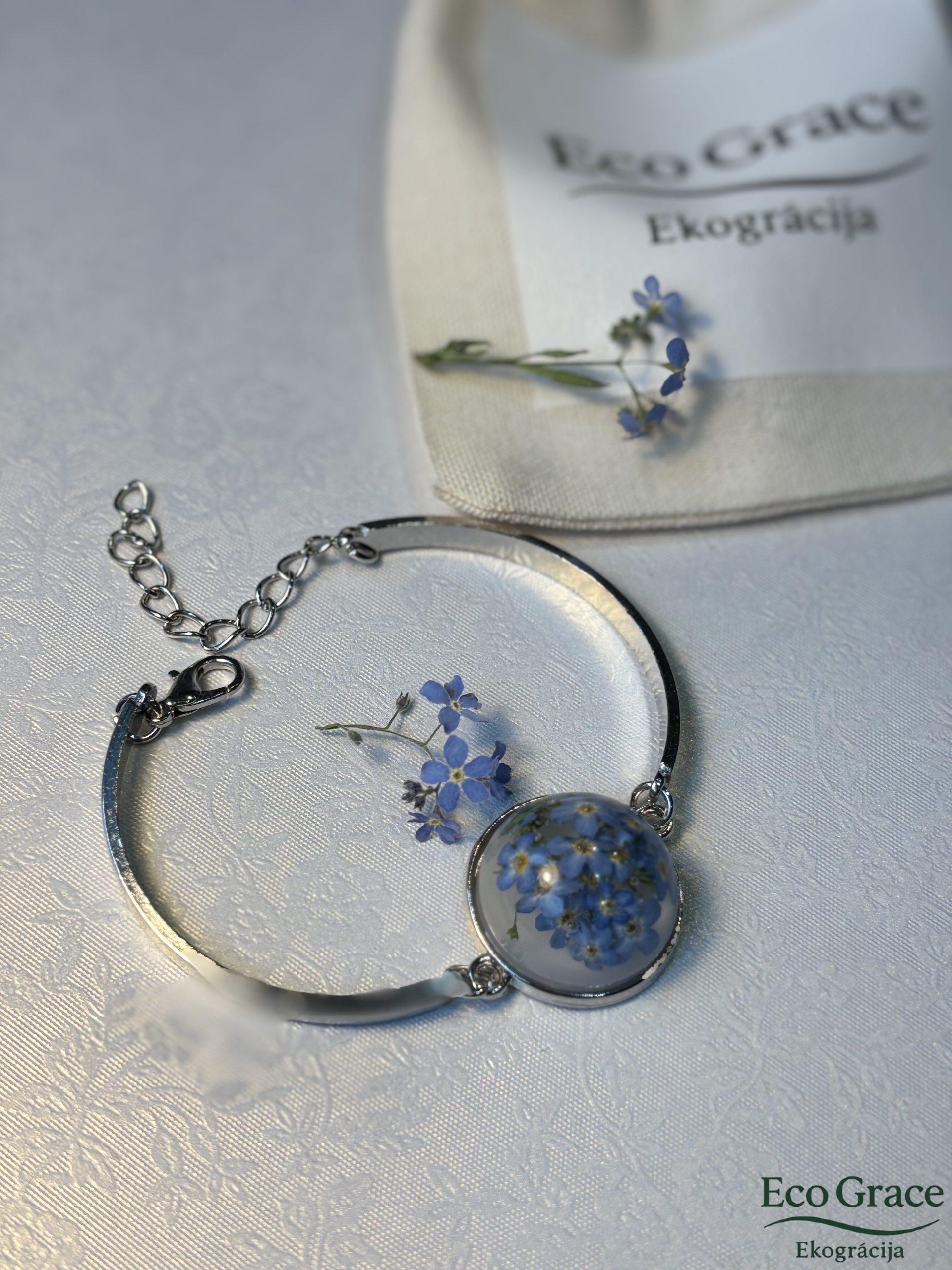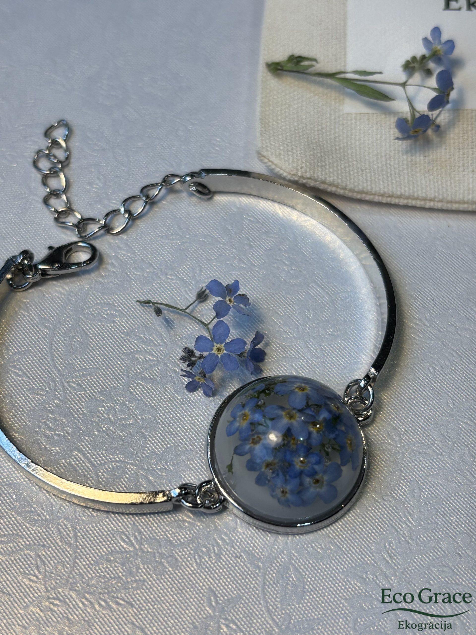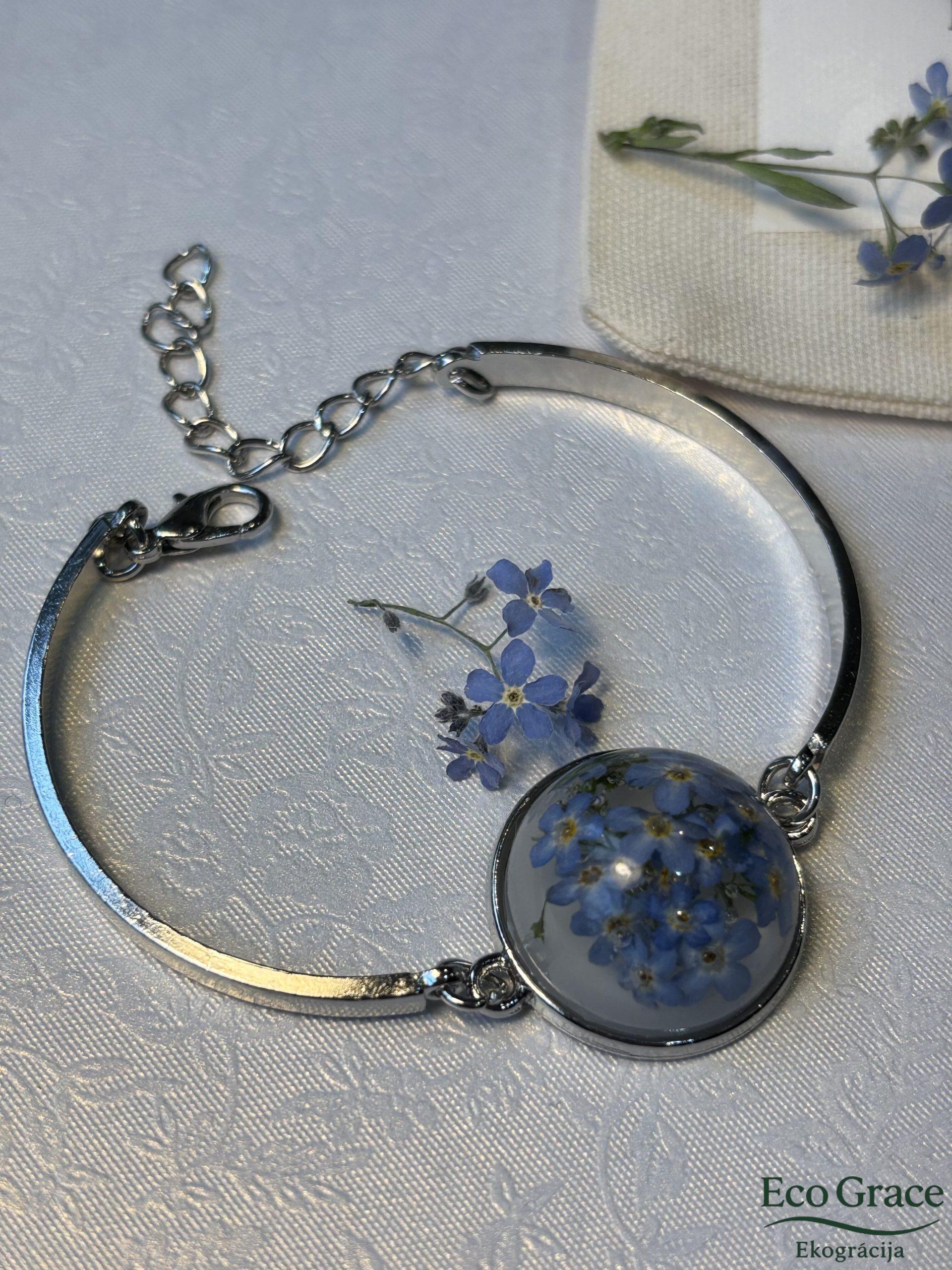 Neaizmirstulīšu rokassprādze, ielieta dzidros epoksīda sveķos, simbolizē mīlestību, uzticību un skaistas atmiņas. Sīkie zilie ziedi saglabā savu trauslo burvību, pārvēršoties elegantā un sirsnīgā rotā.