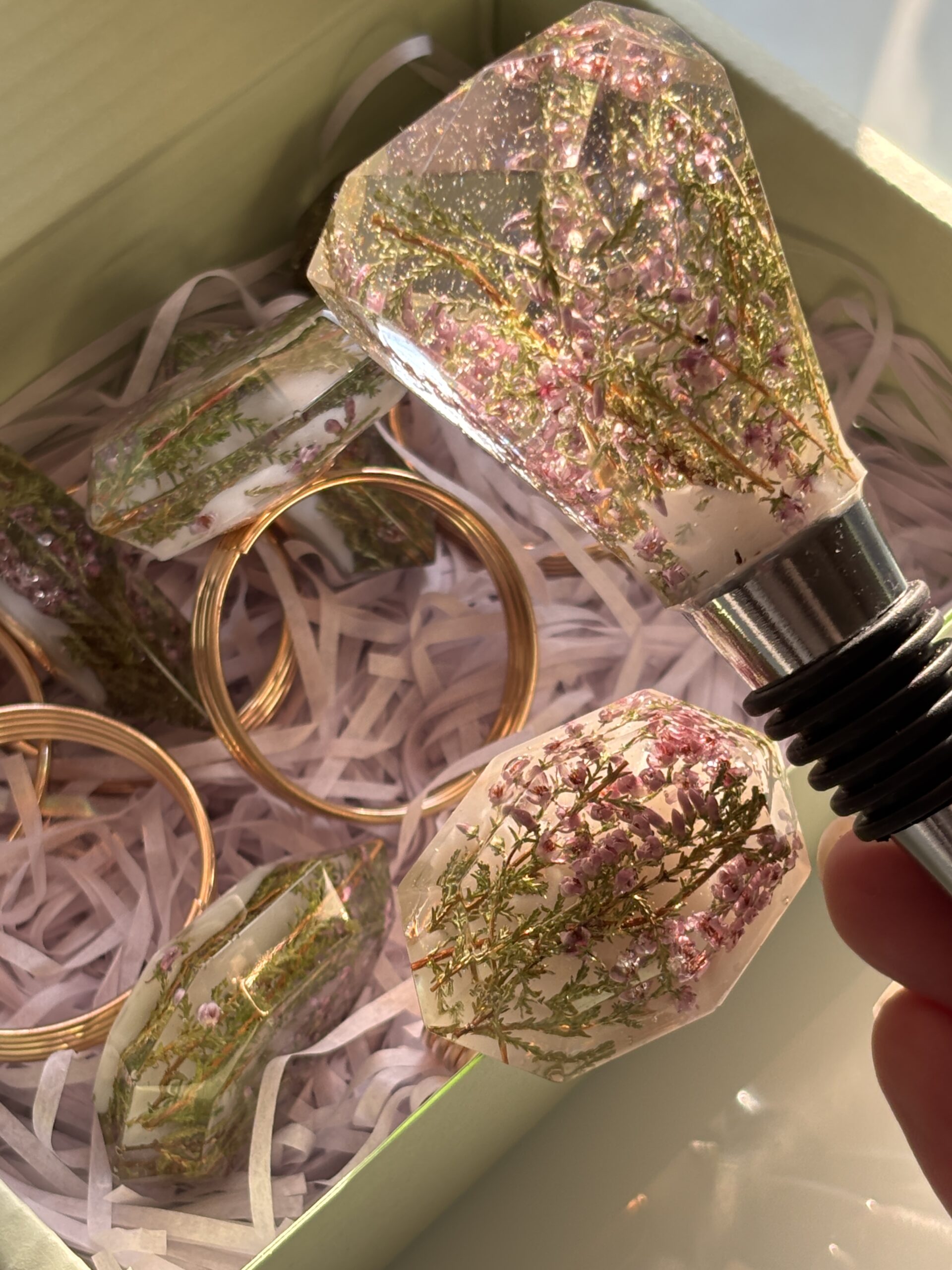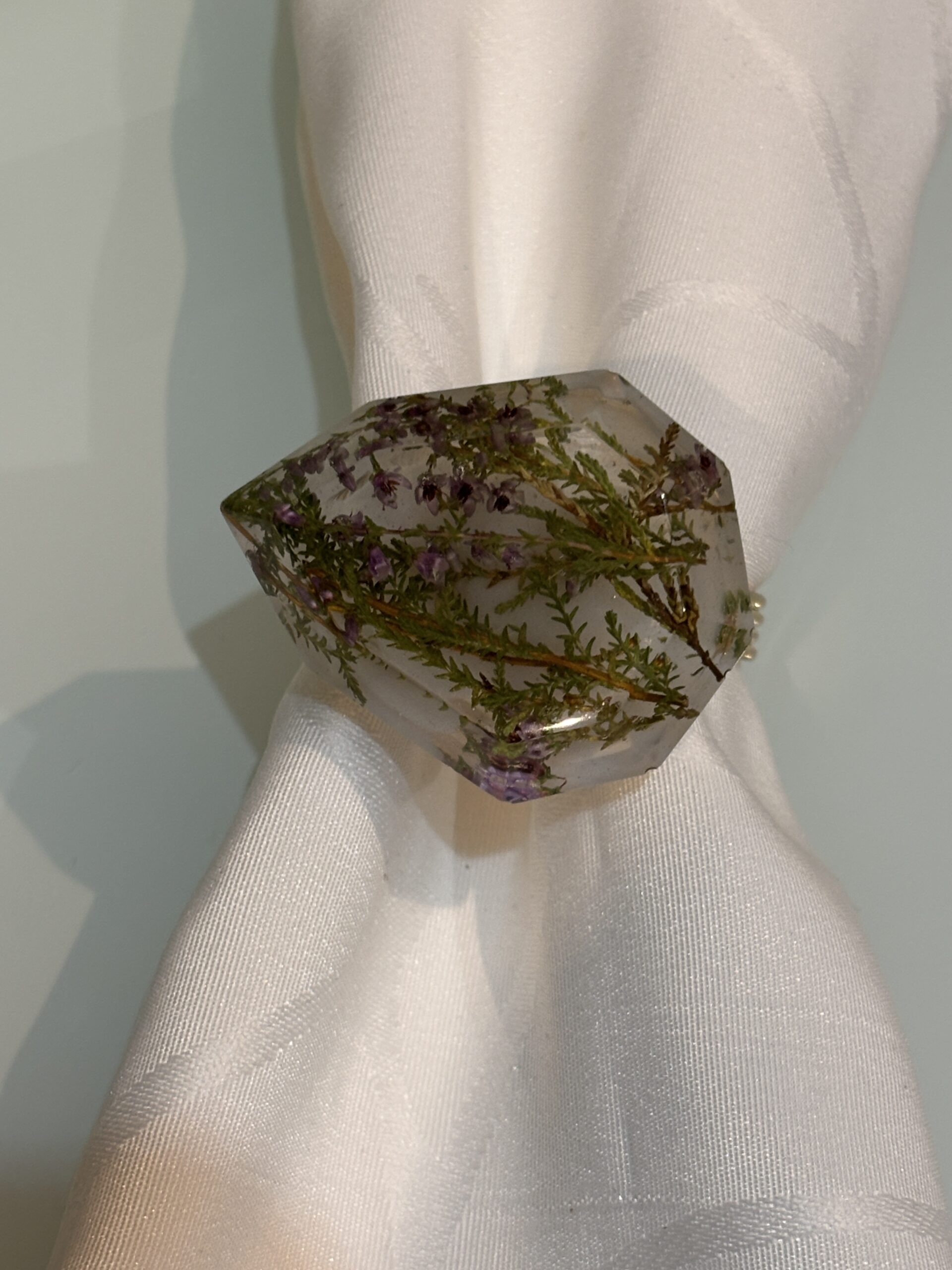 Elegants galda dekora komplekts, kas ienes dabas skaistumu svētku galdā. Salvešu gredzeni un vīna korķis veidoti no dabīgiem, pašu vāktiem un kaltētiem viršiem, kas rūpīgi iemūžināti epoksīda sveķos, saglabājot to trauslo formu un krāsu.
