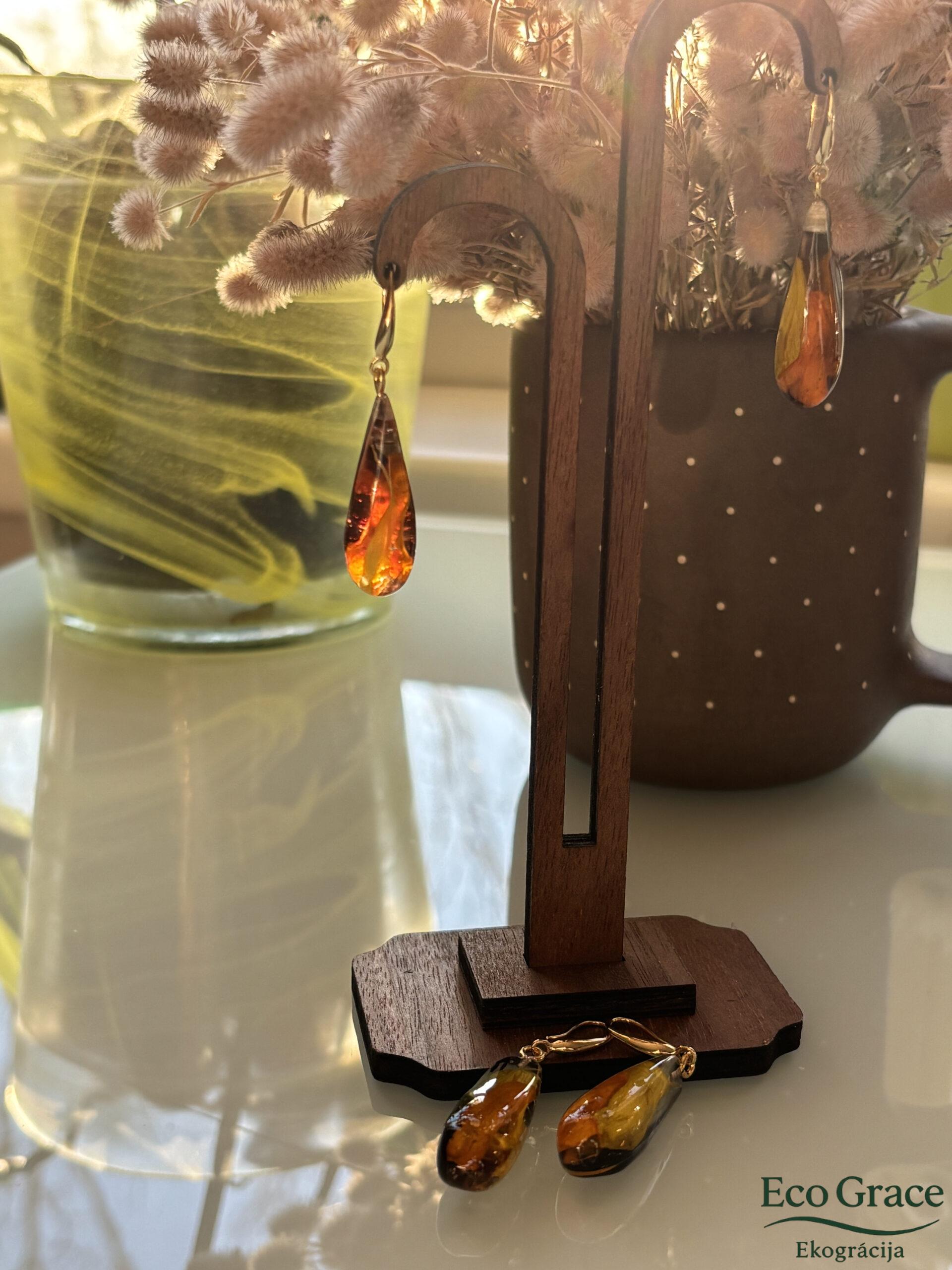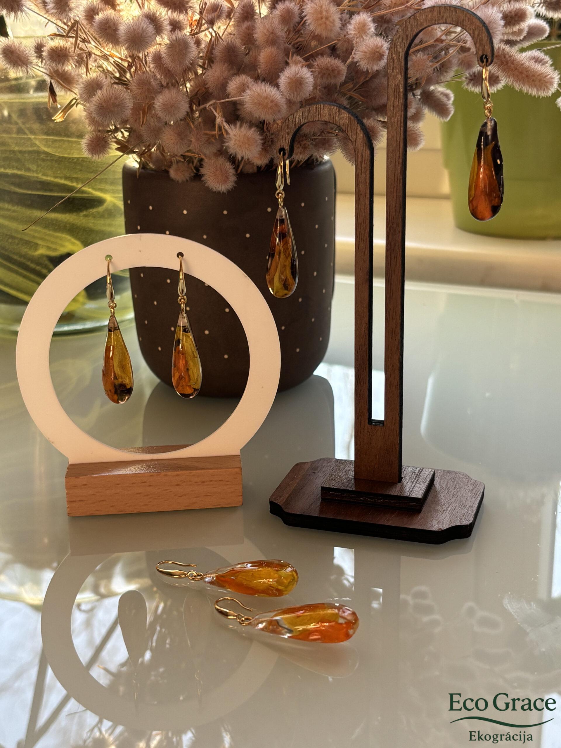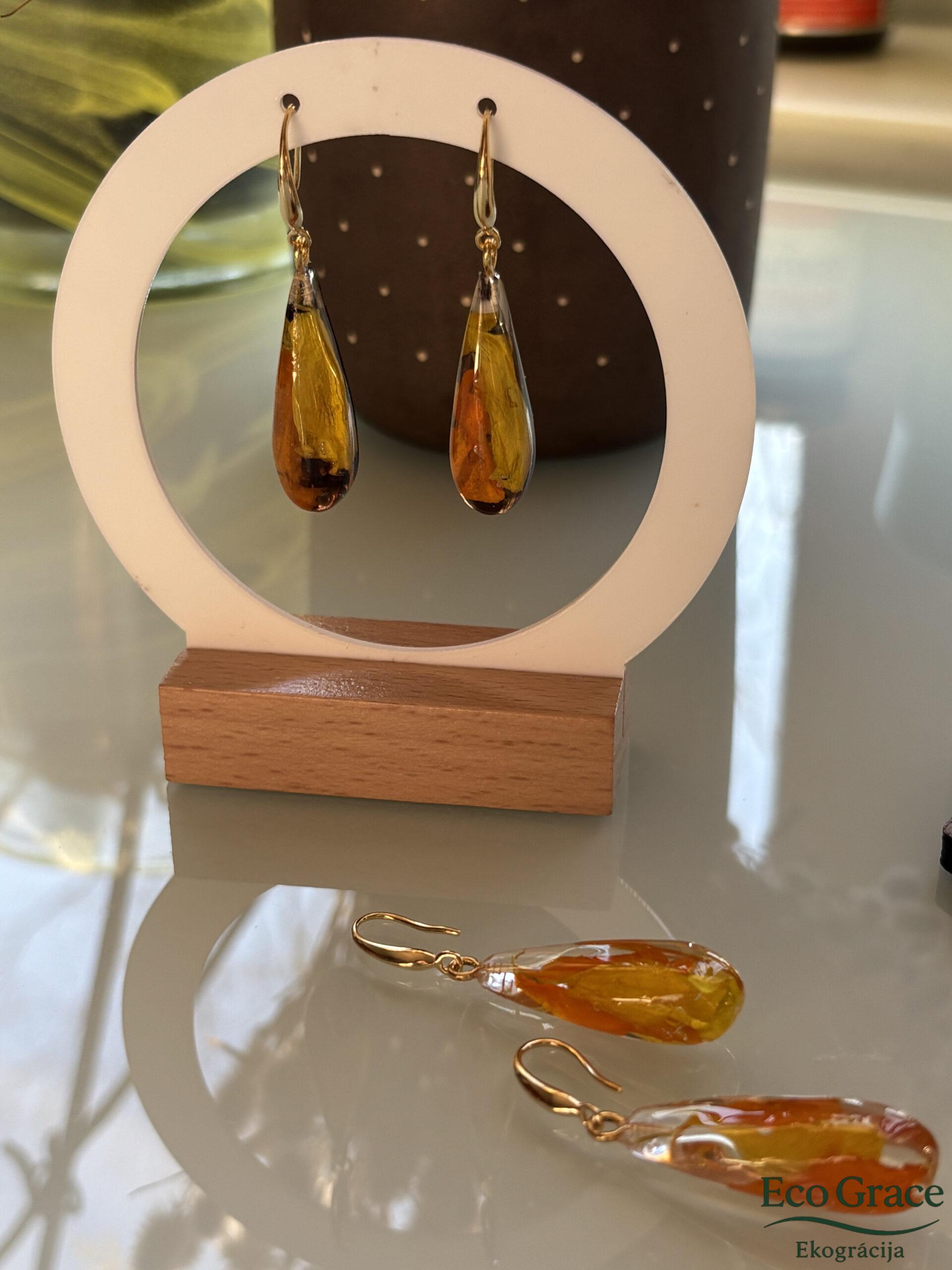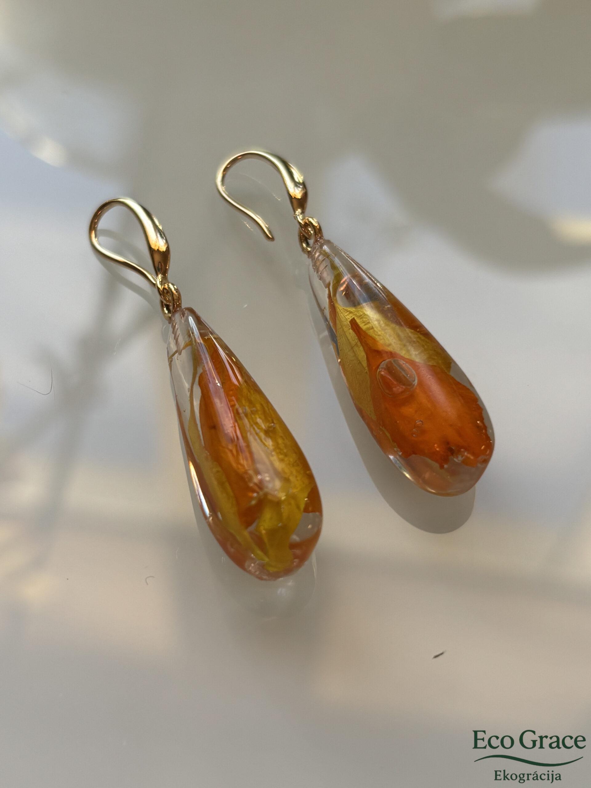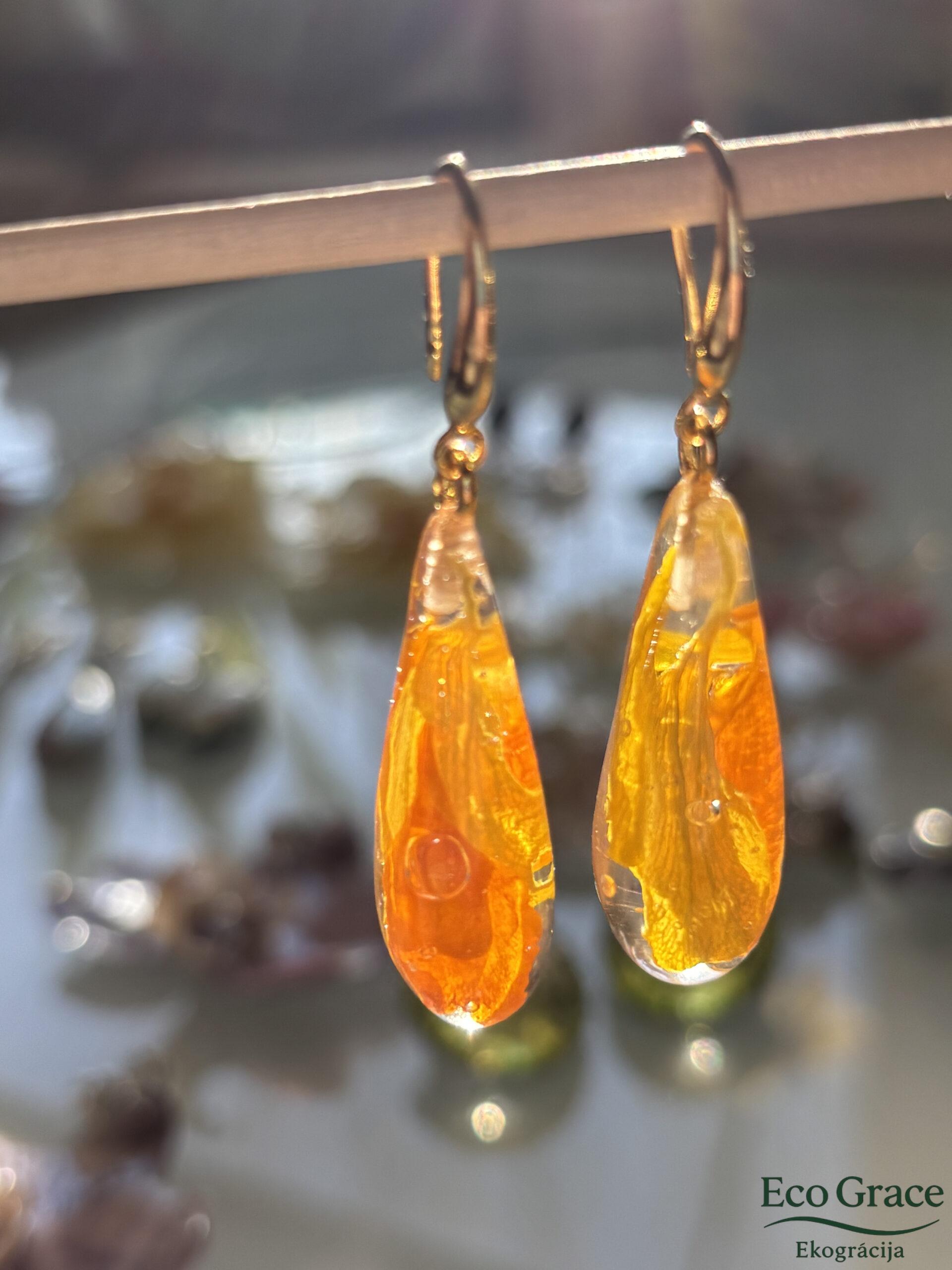 Dabīgas samteņu ziedlapiņas epoksīdā – smalki auskari ar dzintaram līdzīgu noskaņu. Lāsītes forma un kristāldzidrie epoksīda sveķi lieliski izceļ katras ziedlapiņas reljefu.