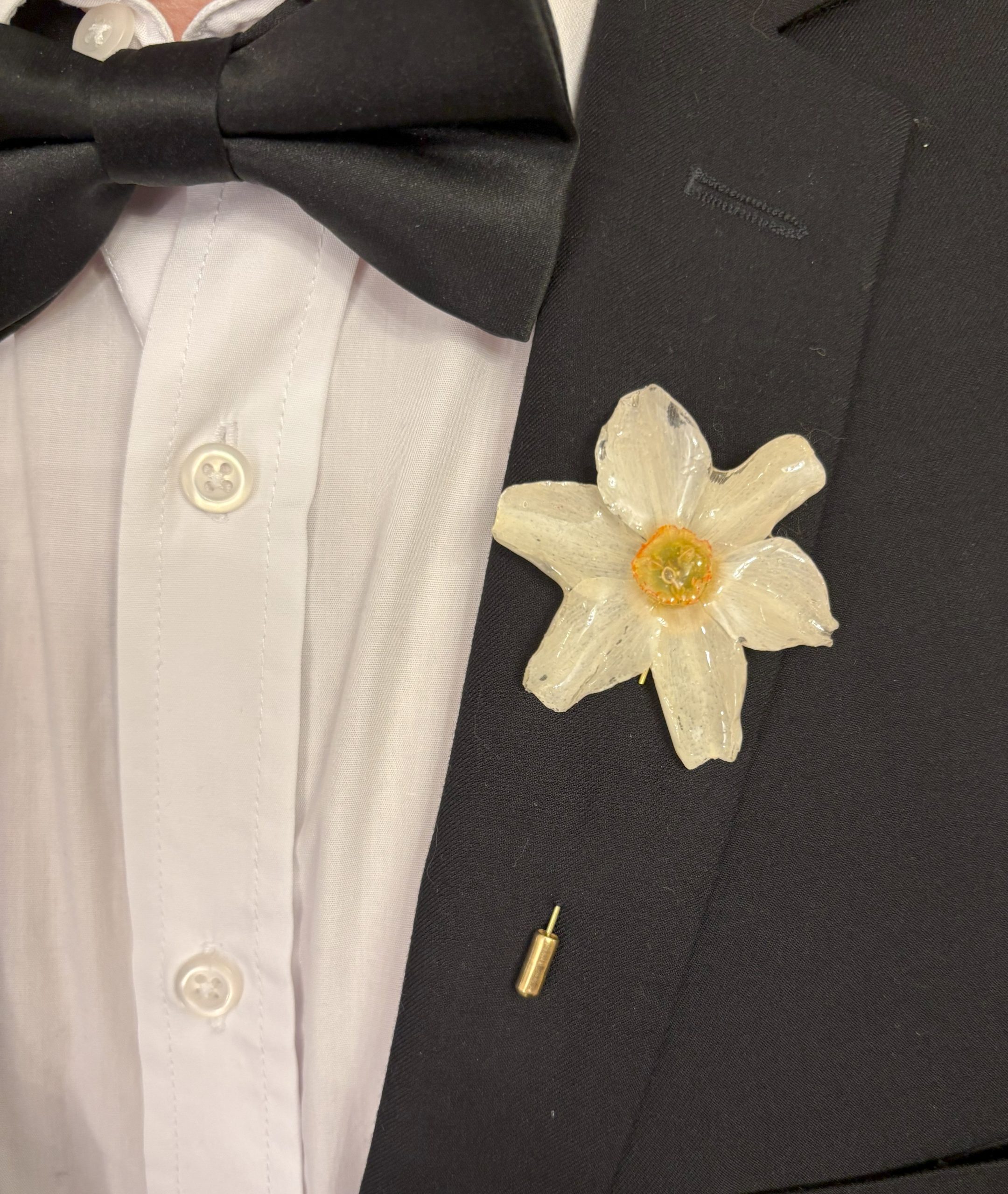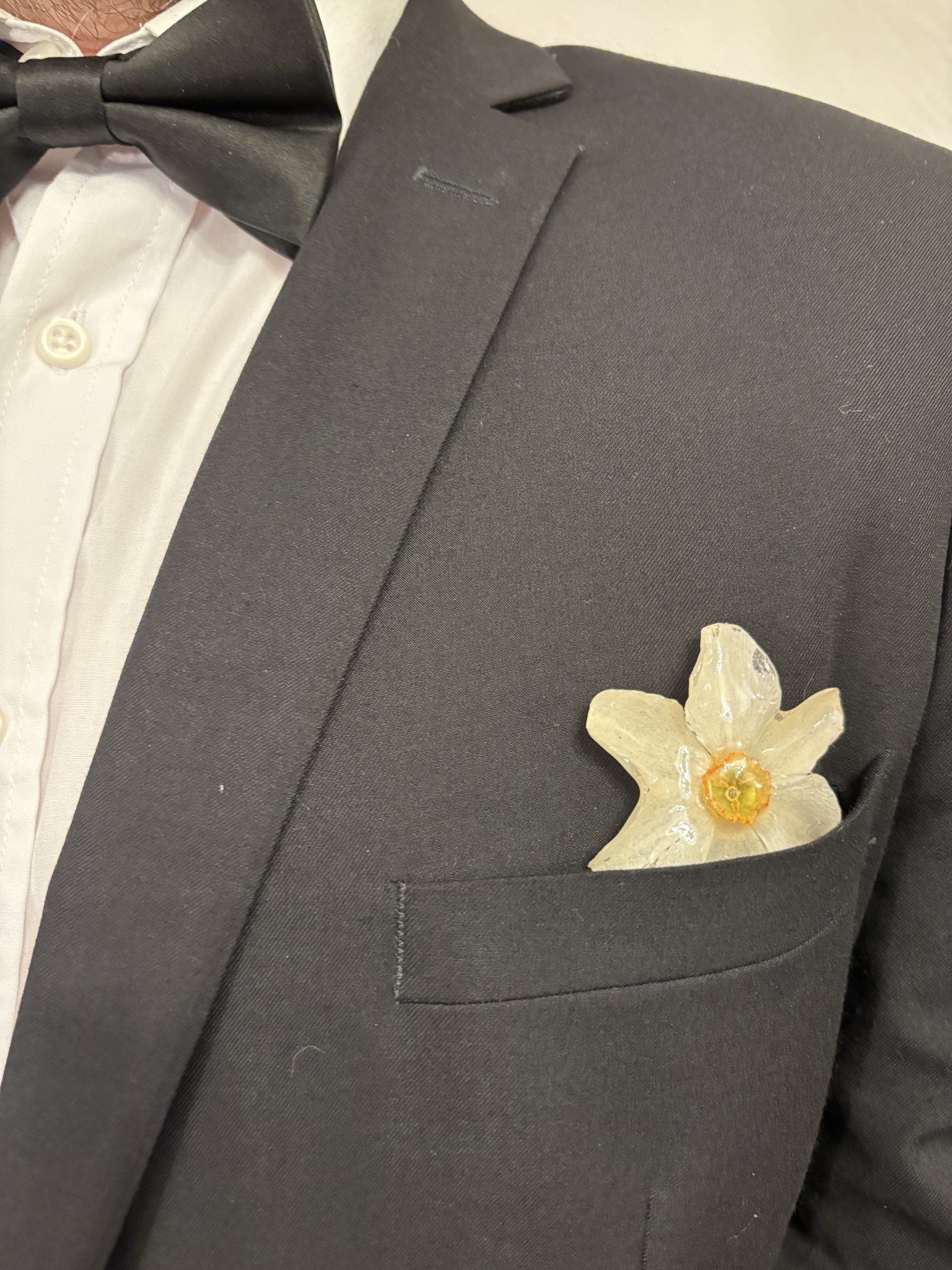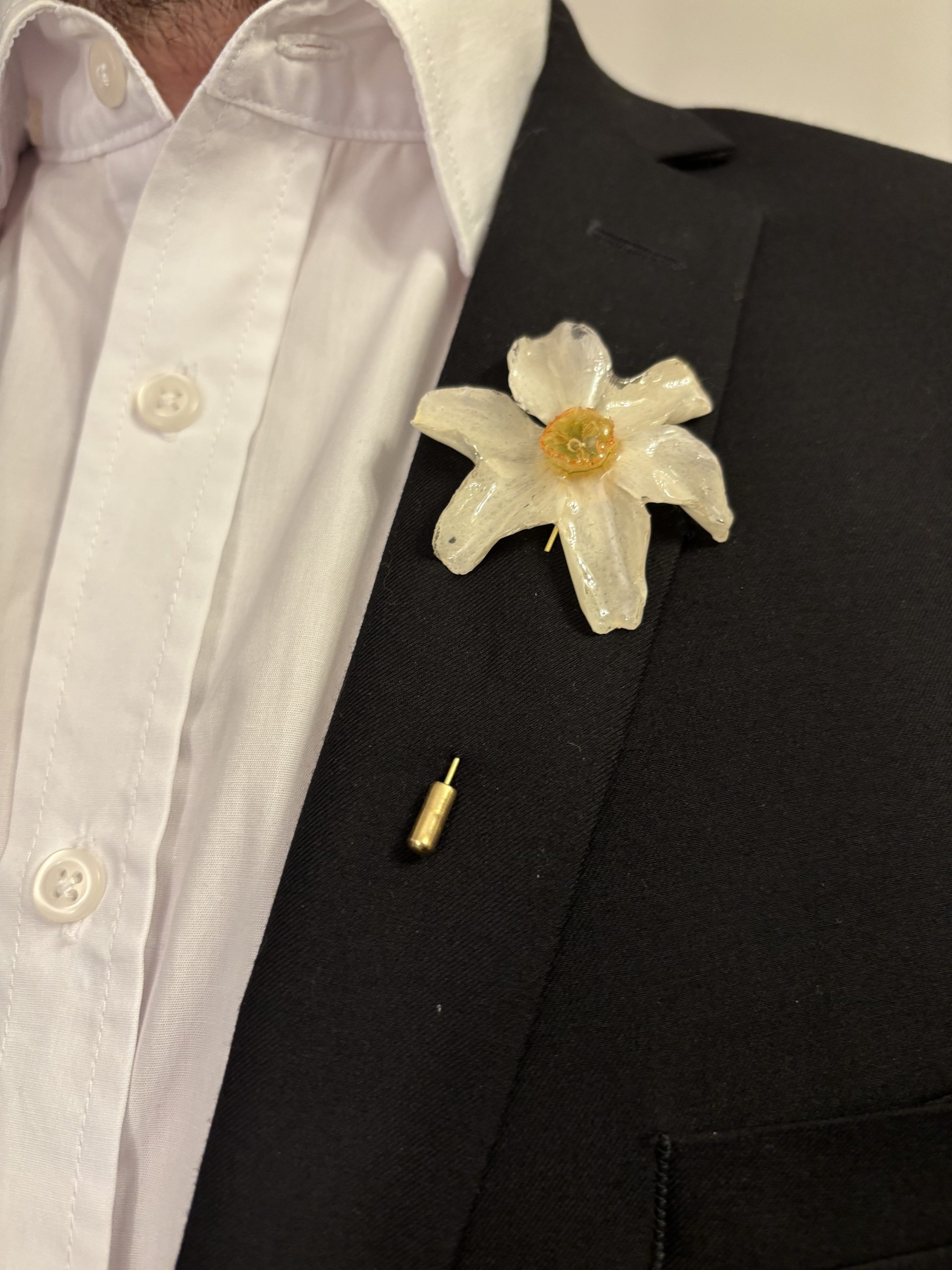 Pievieno savai žaketei izsmalcinātu akcentu! Šī rokām darinātā narcises piespraude epoksīda sveķos iemieso dabas skaistumu un eleganci.